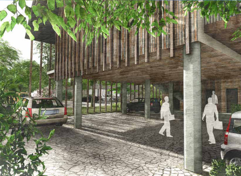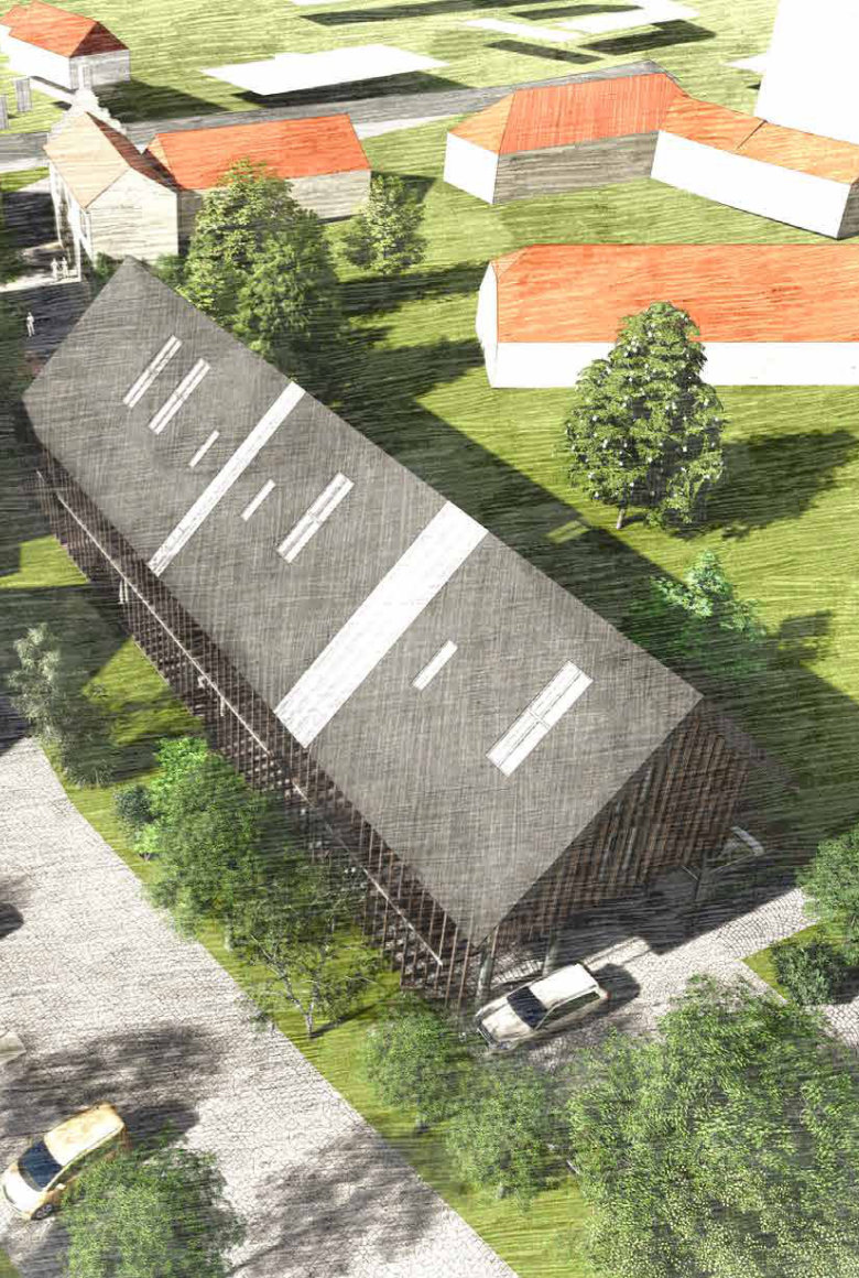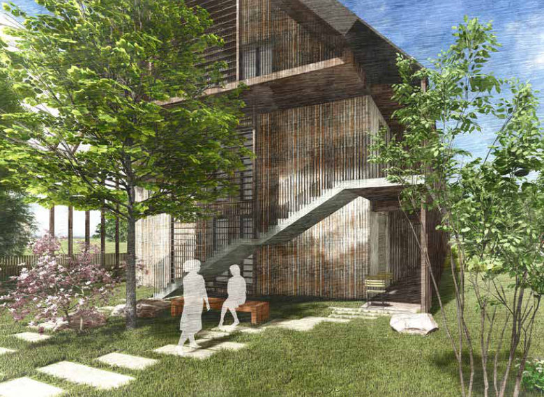 Architektonická forma domu respektuje tradiční středočeskou architekturu. Celý objekt má evokovat stodolu s užitím materiálu jako je omítka na fasádě, kámen na zpevněných površích a předsazené dřevěné plaňky před pavlačemi a terasami. Dvoupodlažní budova se sedlovou střechou se drží formy místních hospodářských stodol.
